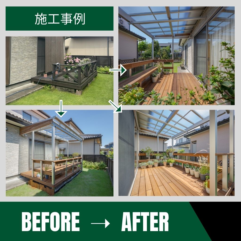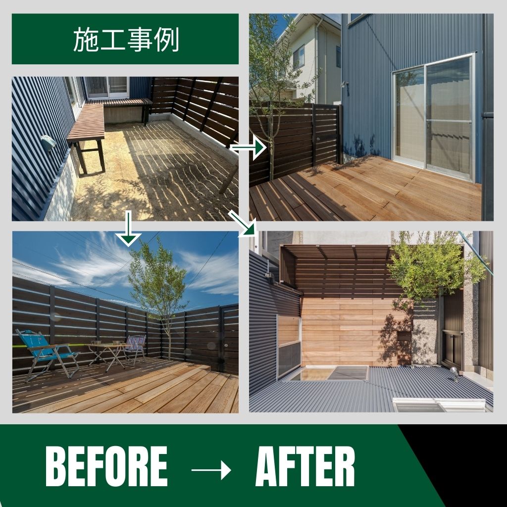 日常に、アウトドアの楽しみを。 庭遊び、グランプガーデン グランプガーデンが手掛けたお庭工事例をご紹介! 「お庭のこんなお悩みはありませんか?」 デッキがボロボロ… リフォームしたいけど、費用が心配 子どもやペットが遊べるスペースを作りたいけど、どうしたらいい? おしゃれな庭にしたいけど、どんなデザインがいいかわからない… ウッドデッキを作ったけど、結局使えていない ご近所の2階から丸見え… プライバシーが気になる 夏は暑い! 虫も多い! 風が強くて快適に過ごせない! せっかくのお庭、もっと快適に活用しませんか? 理想のお庭は、ただデザインするだけでは完成しません。 快適に使うには「環境に合わせた工夫」と「あなたのライフスタイルに合った設計」が必要です。 ーーーーーーーーーーーーーーーーーーーーーーーーグランプガーデンなら、こんな解決策をご提案!ーーーーーーーーーーーーーーーーーーーーーーーー おしゃれで長持ちするデッキリフォーム で安心&快適に ✅目隠しフェンス+植栽 でプライバシーをしっかり確保 ✅日差し&虫対策のパーゴラやシェード で涼しく快適な空間に ✅プロのデザイン提案 で「使いたくなる庭」にアップグレード 「お庭をもっと活かしたい!」そう思ったらまずはお気軽にご相談ください。 お庭作りで失敗しないための 7つのポイント デッキ 外と中の中間領域を作るのがデッキお庭のリビング&ダイニング空間。 天井(テラス屋根) 雨や日差しを防ぎ、近隣の視線もカット。照明や目隠しのベースにも。 壁(フェンス・囲み) サッシで囲み、プライバシーを確保。天気に関係なく、くつろげる空間に。 照明 BGV効果により、庭の価値を2倍に高める重要な照明。夜も楽しめます。 ファニチャー 庭専用のイスとテーブルを準備することで手軽にアウトドアを楽しめる。 自然 雨や日差しを防ぎ、近隣の視線もカット。照明や目隠しのベースにも。 ウリン素材 こだわりたいデッキ、フェンスの素材メンテナンスフリーの天然木『ウリン』 実際にどのような施工が可能なのか事例をご覧ください! 「施工前と施工後の変化をご紹介!」 造作ウリンベンチが想像以上に良すぎるウリンデッキ! ウリンで生まれ変わった理想のデッキ空間長年DIYで大切に使われてきたウッドデッキ。塗装を重ねながら維持されていましたが、ついに限界が…。今回は、高耐久木材「ウリン」を使い、フルリフォームさせていただきました!さらに、お客様のご要望を受けてウリンの造作ベンチを新設しました! 想像以上に素晴らしく、空間にぴったりと馴染んでいます!ナチュラルな木の質感と、快適なベンチスペースでお庭の時間がもっと楽しいこと間違いなしです! リビングから続くオープンリビングになるデッキ! 「せっかくお庭があるのに、使い切れていない気がして…」そんなお悩みからご相談をいただきました!そこで、思い切ってデッキの面積を大幅に拡張!!リビングから続くオープンリビングとして使えるゆとりのある空間に仕上げました。デッキ材には高耐久のウリンを使用し木の質感が美しい、迫力ある景色を実現。さらに、シンボルツリーと目隠しフェンスが調和し開放感とプライベート感を両立した理想のお庭になりました!デッキ材にはウリンを使うことで、リビングから見える景色も迫力あるものになりました! 「実際の施工事例をご紹介!」 ウッドデッキでBBQを楽しみたいけれど、お隣が近くて視線が気になる…。そんなお悩みからご相談をいただきました。 職人が一枚一枚丁寧に張り上げるオーダーメイドのフェンスは、隙間の幅も自由自在!プライバシーを守りつつ、圧迫感のない最適なスリット幅を決定しました! 視線を気にせず快適に過ごせるウッドデッキ空間が完成!おしゃれなフェンスと開放的なデッキで、BBQやくつろぎの時間を存分に楽しめます。 一般的な目隠しフェンスはアルミや樹脂が主流ですが数十年メンテナンス不要の「ウリン」 を採用することで、団地の中でもひと際目を引く仕上がりに。 ブラックのアルミ柱 × ウリンのウッドブラウンは相性抜群。経年変化でシルバーグレーに退色した後もブラックの柱との美しいコントラストが楽しめます。 年月とともに変化する天然木ならではの風合いが住まいの景観に深みを与えます。 ウッドデッキはあるものの、老朽化が進み、危なくてデッキに出られない状態に…。全面リニューアルをご希望ということでご相談をいただきました。 高耐久性と美しさを兼ね備えた、世界最強の天然木「ウリン」を使用したデッキをご提案させていただきました。 天然木ならではの質感と重厚感が生み出す、樹脂製とは一線を画す別次元の仕上がり。本物の木だからこそ感じられる、迫力とぬくもりに満ちたデッキ空間を実現します。 天空のテラス席を演出するため、視線の抜けを大切に天空に浮かぶような心地よさを感じられるデザインに仕上げました。 天空のテラス席を演出するため、視線の抜けを大切に天空